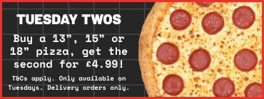 Half & half pizzas are available within these deals with an additional £1 charge. Our pizzas include gluten. -